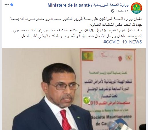 4月9日,卫生部对在努瓦克肖特隔离的126人解除隔离。本周内,努瓦克肖特700名隔离人员中共有约200名解除隔离。卫生部反驳社交媒体上流传的不实谣言,在官方脸书账号发布声明称,卫生部长健康状况良好。为避免民众聚集,政府委派军队向努瓦克肖特2万户家庭发放食品物资,军队已准备150辆卡车,预计5天内完成分发任务。