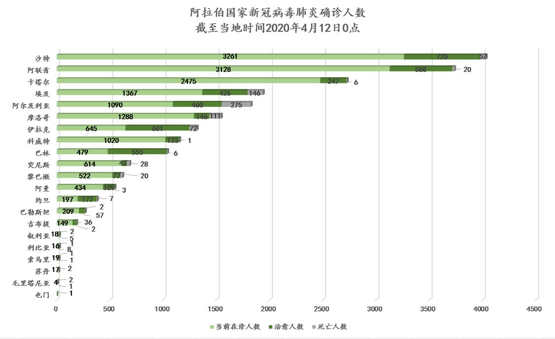 截至当地时间4月12日0点,阿拉伯国家累计确诊22102例,死亡758例,治愈4391例,其中19个国家出现新增确诊病例共计1673例。多国面临医疗设备、防疫物资缺口,除从国外进口外,各国政府呼吁本国具备生产资质企业自主生产,为国家疫情防控贡献力量。部分国家疫情形势趋缓,政府已在保证安全情况下对部分企业、商场复工复产。沙特国王宣布无限期延长宵禁令。突尼斯获国际货币基金组织快速融资。深圳华大基因协助沙特“火眼”实验室建设运营。摩洛哥政府免费安排专机运送滞留在摩的中国公民回国。我驻黎巴嫩大使接受黎电视台视频连线专访。