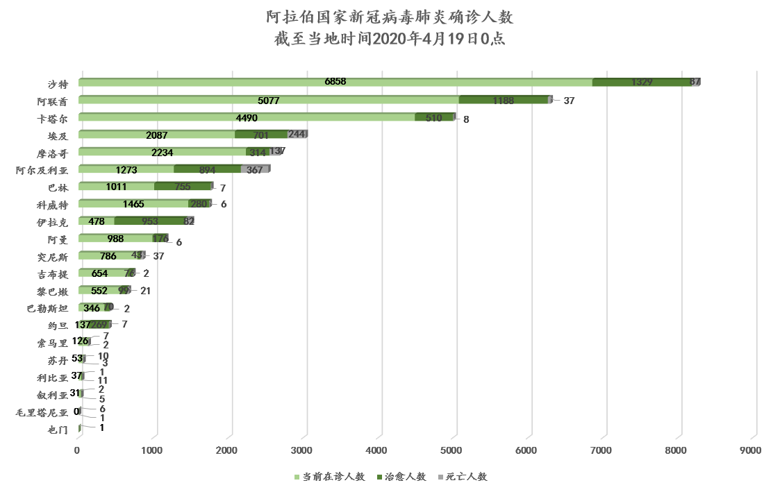 截至当地时间4月19日0点,阿拉伯国家累计确诊37439例,死亡1071例,治愈7680例,其中15个国家出现新增确诊病例共计2236例。约旦、巴林、伊拉克、黎巴嫩等国新增人数显著放缓,正逐步放宽限行令,安排部分产业复工复产。沙特、阿联酋、卡塔尔、埃及、摩洛哥、阿尔及利亚、科威特等国仍处于抗疫胶着期,正不断提升检测覆盖率,严格落实各项防疫措施,广泛开展地区及国际合作。苏丹、索马里、吉布提等国则处于疫情初期爆发阶段,正加强防疫知识宣传,扩大限行范围,保障疫情期间各类物资供应。各国驻外使馆继续撤侨,协助公民登记信息和预订航班。多国慈善组织、基金会发起的捐款及物资募集倡议得到广泛响应,目前已筹集的资金和物资正逐步发放给一线医疗单位。