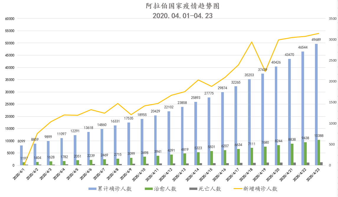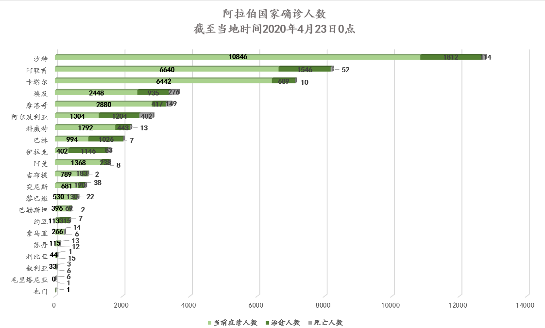 截至当地时间4月23日0点,阿拉伯国家累计确诊49689例,死亡1217例,治愈10388例,其中16个国家出现新增确诊病例共计3145例,再创单日最大增幅。阿尔及利亚确诊病例死亡人数为阿拉伯国家之首,沙特新增确诊数仍居高不下,巴林、突尼斯、吉布提治愈率显著提高。约旦、伊拉克等国初步控制住疫情,逐步启动后危机管理计划,出台青年人就业保障机制,为失业人群发放补贴。黎巴嫩、突尼斯、巴勒斯坦疫情持续向好,政府仍持谨慎观望态度,开始小规模复工复产。吉布提、索马里、利比亚、苏丹等处于疫情初期的国家面临物价上涨、物资短缺等问题,部分国家获得地区国家和国际组织援助。疫情导致民众对线上服务需求增加,推动各国持续优化互联网技术水平。我驻科威特大使接受当地主流媒体专访;中国国家卫健委主任参加G20卫生部长会议;中国政府援阿尔及利亚、伊拉克医疗物资运抵。