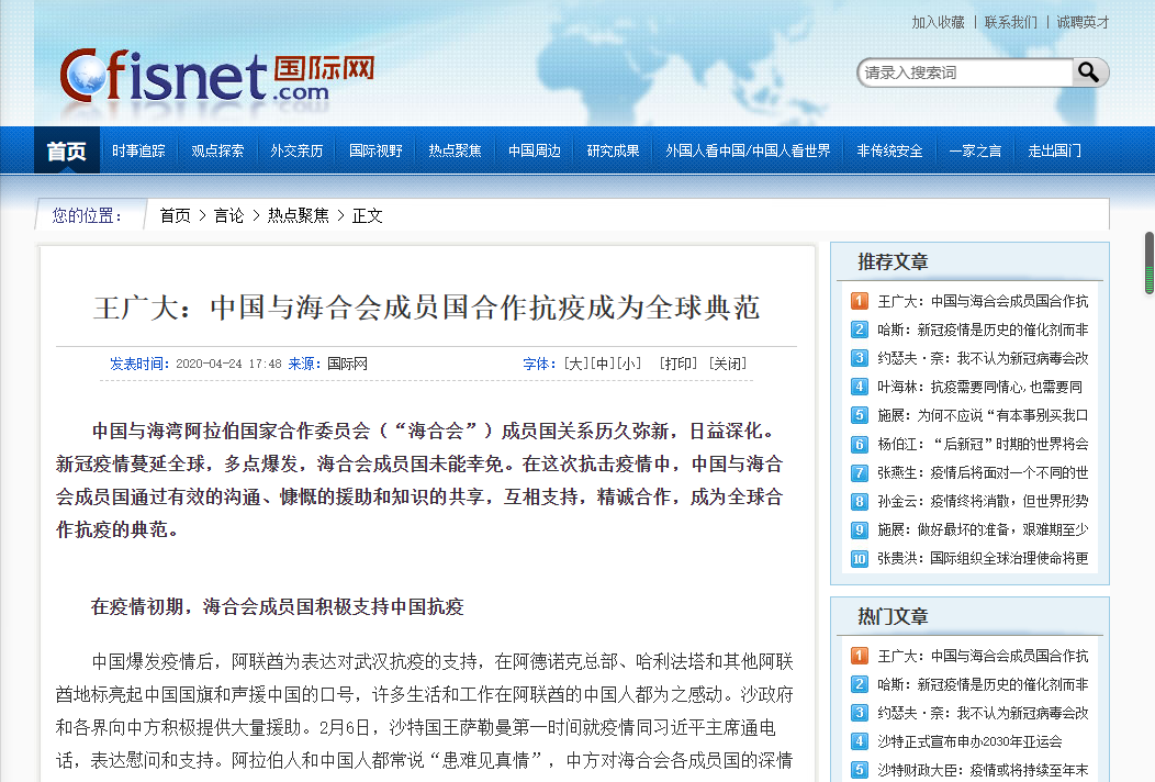 事实上,中国国内抗疫和支持全球抗疫的努力都受到海合会成员国的高度认可和称赞。沙特国王萨勒曼在与习近平主席通电话时,感谢中方为沙特抗击疫情提供检测和医疗物资援助,沙特人民将始终坚定同中方站在一起。阿联酋外交与国际合作部长阿卜杜拉最近提到中国是“通过领导人、政府和人民间的合作团结,最终渡过艰难时刻的最好例证”。近日,美国智库大西洋理事会网站发布该会非常驻高级研究员、阿布扎比扎耶德大学政治学助理教授乔纳森·富尔顿(Jonathan Fulton)文章,作者援引《纽约时报》文章指出,中国在此次疫情中已成为“全球危机时刻负责任的全球领导者。”