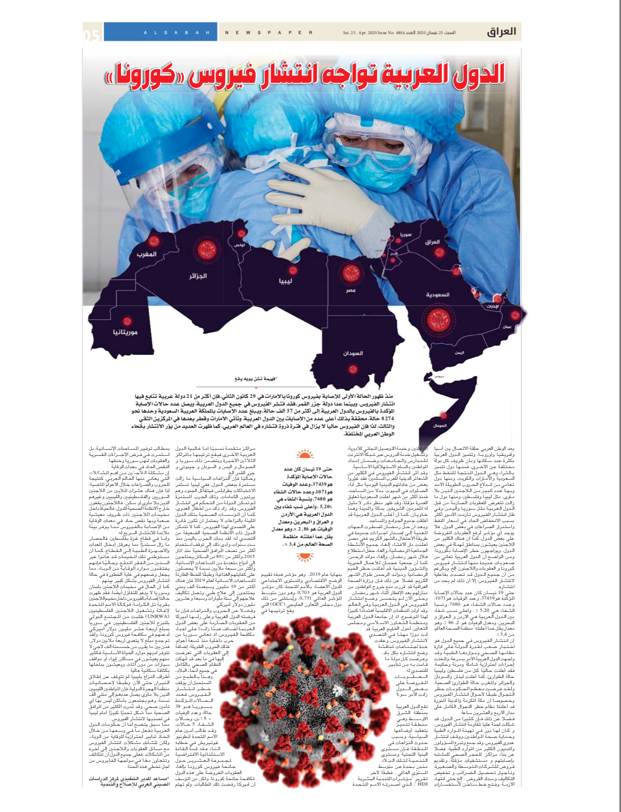 截止419021个阿拉伯国家累计确诊37439例,死亡1071例,治愈7680例。近几日每日新增确诊病例均超2000例,多次创下单日最大增幅。平均治愈率约为20.5%,治愈率最高的三个国家为约旦、伊拉克和巴林;平均致死率约为2.86%,低于世界卫生组织平均数据。