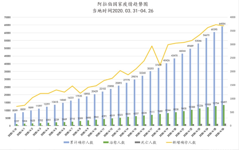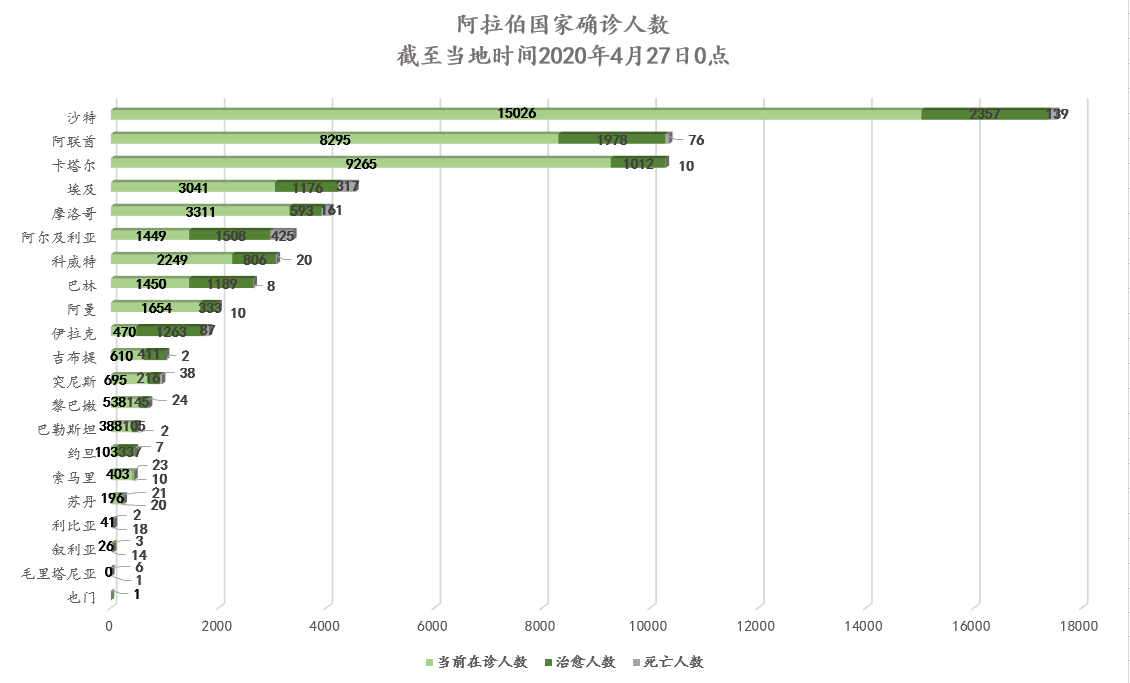 截至当地时间4月27日0点,阿拉伯国家累计确诊64084例,死亡1376例,治愈13497例,其中17个国家出现新增确诊病例共计3689例,略有下降。除沙特外,阿联酋、卡塔尔累计确诊破万例。约旦、突尼斯、巴勒斯坦、黎巴嫩疫情稳定。伊拉克疫情出现反弹后,宣布重启出行禁令。海合会成员国及北非国家继续扩大检测范围、推进撤侨行动,新增确诊数仍居高不下,有国家利用经典SIR传染病模型预测疫情趋势。部分国家利用疫情期间募集资金,优化账目管理方式,用于疫情后的危机管理及斋月慈善活动支出。我驻阿尔及利亚、卡塔尔、巴林大使在当地主流媒体发声,参与斋月募捐活动;中国同苏丹疾病防控专家举办视频经验交流会;中国医疗队撤离伊拉克并交付援建CT检查室;华大基因与沙特签署“火眼”实验室建设合同。