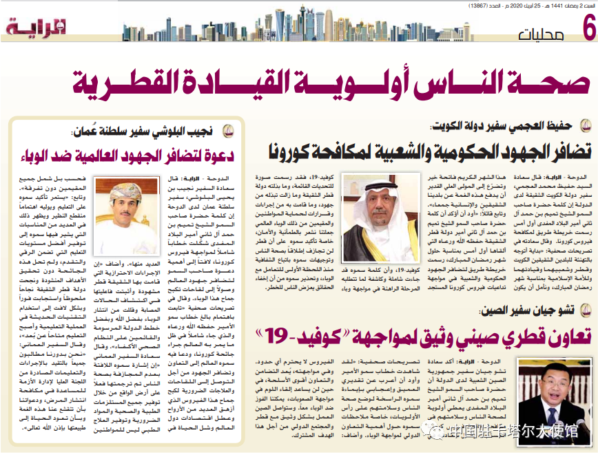 卡塔尔:新增确诊929例,治愈83例;周剑大使赞扬卡埃米尔在民众安全问题上的立场;呼吁解除对卡封锁
