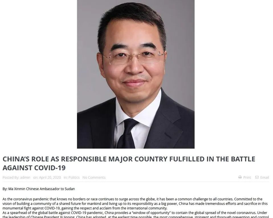 中国驻苏丹大使馆:驻苏丹大使马新民在苏《关注报》、《今日喀土穆报》“中国聚焦”专栏发表题为《中国战“疫”彰显大国担当》的署名文章。