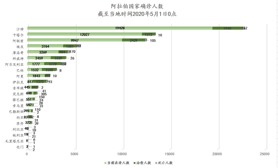 截至当地时间5月1日0点,阿拉伯国家累计确诊79035例,死亡1571例,治愈17702例,其中16个国家出现新增确诊病例共计3954例,再创单日最大增幅。沙特、卡塔尔单日新增再创新高。伊拉克疫情持续反弹。约旦、突尼斯、巴勒斯坦、黎巴嫩疫情稳定,启动留学生归国、大学复学计划,向多产业提供资金补助,鼓励民众自行耕种和养殖,实现自给自足。苏丹、吉布提、索马里等国疫情逐渐扩散,出现药价上涨、物资短缺等问题。多个海合会国家采用车内检测法提升检测效率,排查劳工居住区安全隐患。阿联酋向上海开通一班临时航班。欧盟向巴勒斯坦、摩洛哥提供食品、资金援助。我驻阿联酋大使同阿外交部东亚司司长举行视频会见;沙特外交部发布我驻沙大使支持沙抗疫视频;我驻苏丹大使在当地主流媒体发文;约旦、巴勒斯坦、中国医疗专家举行三方视频会议;中国援科威特医疗专家组为旅科侨胞召开疫情防控视频交流会。