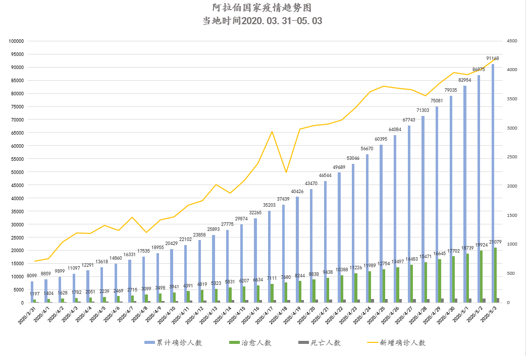 截至当地时间5月4日0点,阿拉伯国家累计确诊91168例,死亡1705例,治愈21079例,其中16个国家出现新增确诊病例共计4193例,再创单日最大增幅。沙特单日新增再创新高。伊拉克每日仍有大量新增病例。约旦、突尼斯、巴勒斯坦、黎巴嫩疫情稳定,撤回滞外侨民行动持续推进;部分行业拒绝复工,抗议政府未对相关从业者提供复工补贴与保障。苏丹、索马里新增涨幅较大。海合会成员国及北非国家已在落实严格防疫措施的前提下允许部分行业复工或放宽出行限制,同时积极进行医学科研攻关、开展国际防疫经验交流。多国高度赞扬疫情期间媒体人士在普及新冠知识、引导舆论、保障民众知情权等方面做出的杰出贡献。我驻阿联酋大使倪坚与阿外交与国际合作部助理次长、阿驻华大使举行视频会议;我驻卡塔尔大使周剑录制声援卡抗疫视频。