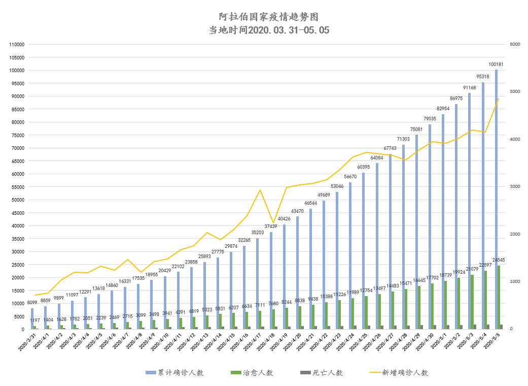 截至当地时间5月6日0点,阿拉伯国家累计确诊100181例,死亡1798例,治愈24545例,其中18个国家出现新增确诊病例共计4863例,再创单日最大增幅。沙特累计确诊首破3万例,卡塔尔新增数再创新高。伊拉克疫情持续反弹,正收紧出行禁令,进一步遏制疫情扩散。约旦、黎巴嫩、突尼斯、巴勒斯坦等国疫情好转,但为谨慎起见继续延长国家紧急状态或全国总动员状态,对复工复产的企业及商业场所提出严格防控要求。海合会成员国及北非国家经济受到疫情巨大冲击,部分国家面临资金储备枯竭、财政赤字飙升、公共债务增加的困境,正调整货币政策、重新安排政府事务优先级,促进经济复苏。苏丹、索马里今日增幅较大,收到物资援助,索一架运载医疗物资飞机被误击。多国外交事务负责人参加不结盟运动首脑视频会议,呼吁加强多边合作,共同抗疫。我驻巴勒斯坦主任在巴官方媒体发表署名文章;中国援突尼斯物资抵达。