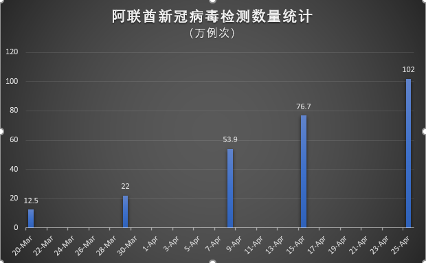 近期,阿联酋单日检测量已提升至2.5万例次。根据卫生与社会预防部通报的累计检测数据,自3月下旬至4月下旬,单日检测已从9.5万例次增加到102万例次。截至426日,其新冠病毒累计检测数量位居世界第五,仅次于美国、俄罗斯、德国、意大利。