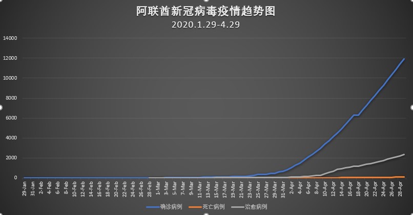 阿联酋新冠病毒疫情趋势图(2020.1.29~4.29