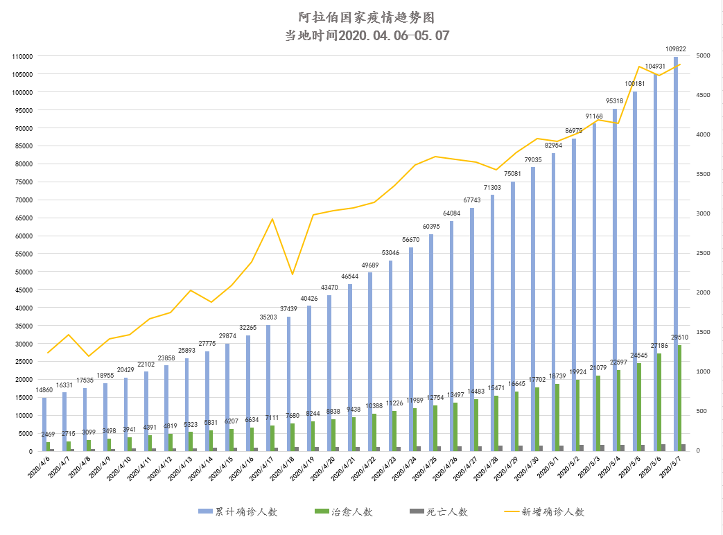 截至当地时间5月8日0点,阿拉伯国家累计确诊109822例,死亡1904例,治愈29510例,其中18个国家出现新增确诊病例共计4891例,再创单日最大增幅。沙特、卡塔尔单日新增再创新高。黎巴嫩新增病例数出现小幅反弹。约旦、突尼斯、巴勒斯坦三国疫情稳定,逐步解封相关地区和行业,评估疫情对经济影响并制定相关应对政策。鉴于新冠疫情可能与人类长期共生,海合会成员国及北非国家在疫情形势依旧严峻的情况下,开始考虑如何尽快恢复生产生活,保障经济、民生可持续发展,同时加大抽检力度,严打违反防疫规定行为。较晚爆发疫情的国家中,利比亚、吉布提疫情控制较好,每日新增量少且治愈率较高;苏丹、索马里疫情扩散较快,多地延长封锁时间,注重防疫经验积累。我驻苏丹大使马新民、驻索马里大使覃俭分别同所在国官员通电话;我驻巴勒斯坦主任郭伟同巴解组织执委会秘书长讨论防控疫情国际合作;中国援阿尔及利亚第三批防疫物资运抵;中国援吉布提医疗专家组走访当地医院。