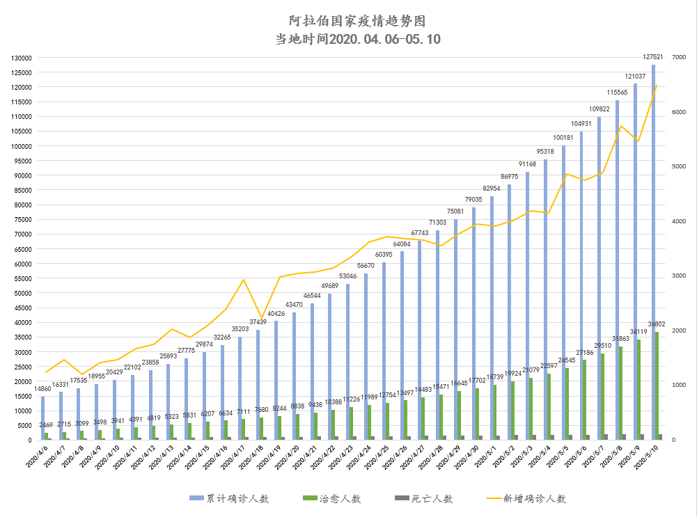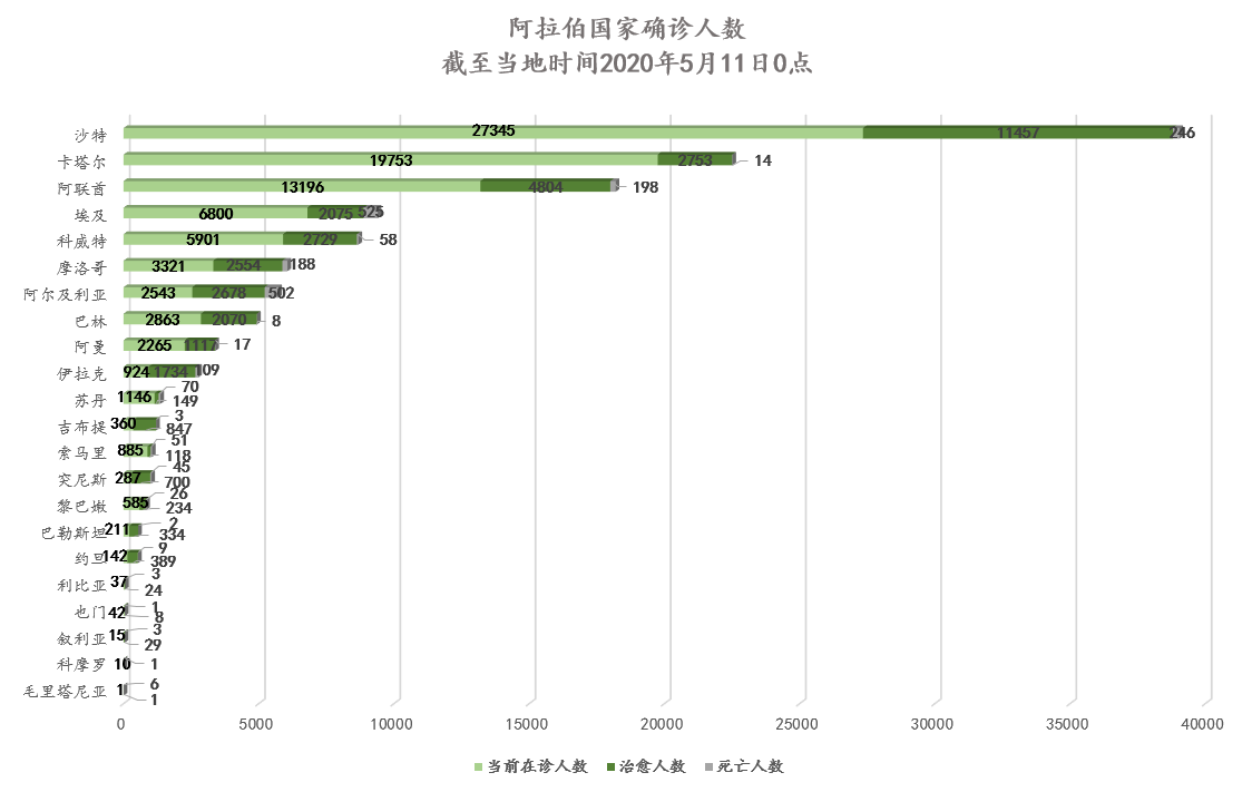 截至当地时间5月11日0点,阿拉伯国家累计确诊127521例,死亡2087例,治愈36802例,其中18个国家出现新增确诊病例共计6484例,再创单日最大增幅。沙特、卡塔尔、科威特创单日新增最高纪录。疫情持续好转的国家中,约旦、黎巴嫩近期单日新增出现小幅上涨,黎巴嫩延长宵禁时长;突尼斯、巴勒斯坦在诊人数持续下降,多省患者清零。较晚暴发疫情的国家中,苏丹、索马里、也门疫情蔓延趋势明显,多国升级防控措施,呼吁民众保持高度警惕,同时收到欧盟国家援助;吉布提、利比亚防疫效果显著,吉布提将逐步放宽出行禁令,利比亚则继续执行宵禁令。海合会成员国及北非国家今日普遍新增涨幅较大,多国创下最高新增纪录,已出台经济刺激计划,修改融资政策,提出振兴旅游业建议,多方位促进经济复苏。中国政府第二批援助埃及物资运抵;李克强总理与新任伊拉克总理通话;吉布提总理代表总统向中国政府抗疫医疗专家组成员授予独立日国家勋章。