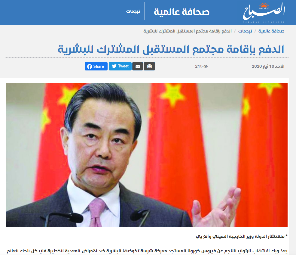 中国驻伊拉克大使馆:5月10日,伊拉克发行量最大的官方报纸《晨报》全文刊发王毅国务委员兼外长题为《以习近平外交思想为指引 在全球抗疫合作中推动构建人类命运共同体》的署名文章(阿文)。
