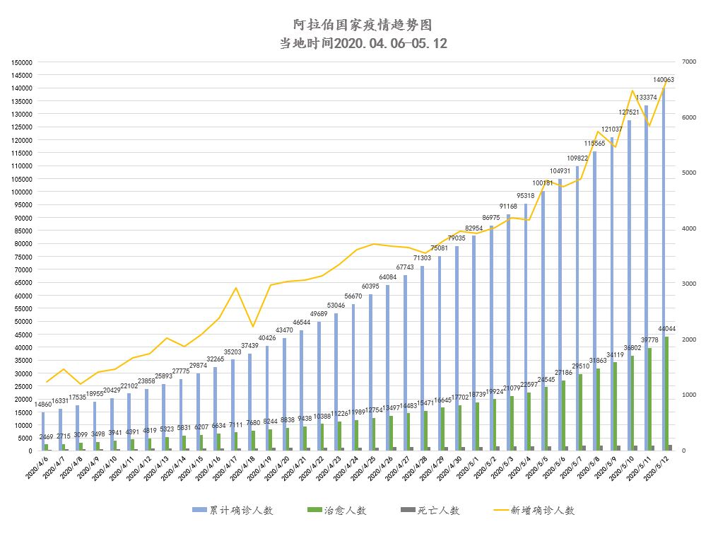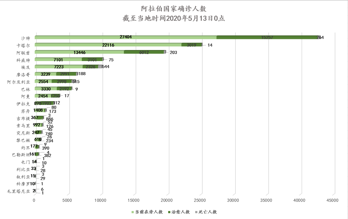 截至当地时间5月13日0点,阿拉伯国家累计确诊140063例,死亡2178例,治愈44044例,其中16个国家出现新增确诊病例共计6689例,再创单日最大增幅。沙特、卡塔尔单日新增再创新高。埃及累计确诊数首破1万例。伊拉克疫情持续反弹,考虑重启全面出行禁令。约旦、黎巴嫩计划再次加强疫情防控措施;突尼斯、巴勒斯坦疫情已得到控制,正积极应对疫情对经济的冲击。海合会成员国和北非国家继续扩大检测范围,增设收治医院,延长封闭措施期限,多国为民众提供免费新冠病毒检测,其中埃及收到IMF贷款援助。吉布提、利比亚疫情稳定;苏丹、索马里、也门疫情形势严峻,仍然有大量民众违反宵禁令。多国在国际护士节之际,感谢医务人员为抗击疫情做出的巨大牺牲,为医务人员提供出行便利或优惠政策。伊拉克《晨报》刊载王毅国务委员兼外长署名文章;我驻也门大使会见也外交部副部长;我驻伊拉克大使拜会新任伊卫生部长;我驻迪拜总领事与迪拜抗疫指挥控制中心主席举行视频会议;中国政府新一批援吉布提医疗物资运抵;我驻毛塔使馆、中资企业及华侨向毛捐赠斋月食品物资;中国国际应急医疗队(澳门)将参与中国赴阿尔及利亚抗疫任务。
