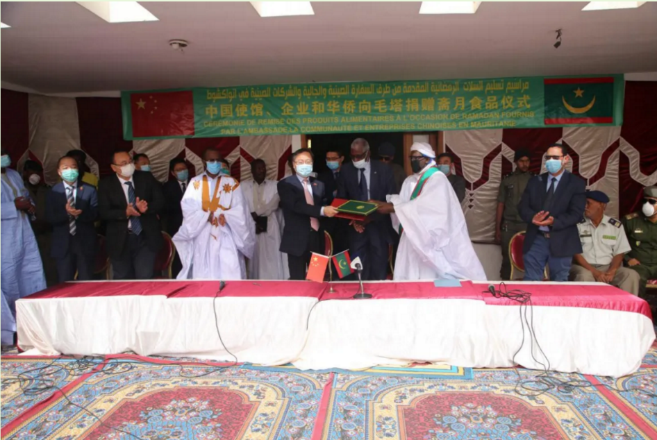 中国驻毛里塔尼亚大使馆:日前,我驻毛塔大使张建国与努瓦克肖特南部大区区长萨莱克、利雅得区区长伊迪斯出席了我驻毛塔使馆与中资企业及华侨社团支援毛塔抗击新冠疫情、捐赠斋月食品物资仪式。使馆经商参赞席威、中资企业和华人华侨代表,以及毛国民议会议员代表、毛通社、毛塔电视台记者等三十余人参加上述活动。