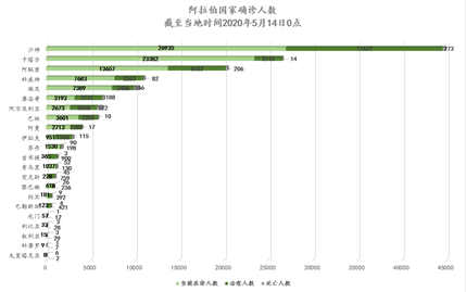 截至当地时间5月14日0点,阿拉伯国家累计确诊146405例,死亡2233例,治愈47793例,其中18个国家出现新增确诊病例共计6342例,小幅下降。阿联酋累计确诊破2万,沙特首次出现在诊人数下降趋势。伊拉克疫情持续反弹,大量民众违反防疫规定。约旦疫情稳定,黎巴嫩将实施短期彻底封国;突尼斯、巴勒斯坦在诊人数稳步下降,突尼斯已连续三日无新增。海合会成员国继续实施宵禁等限行措施,恢复部分经济活动,出台政策刺激经济复苏、保障石油市场平衡;北非国家亟待提升检测数量,加强青年人疫情防范意识。吉布提疫情可防可控,目前出现大量无症状患者,正谨慎应对;苏丹、索马里、也门疫情持续蔓延,正加紧向各地发放医疗物资,加强公共场所消杀。多国政府和慈善组织向受疫情影响家庭、行业发放补助,保障社会稳定。我驻苏丹、黎巴嫩、毛塔等国大使与当地官员会见或通话;我驻埃及大使在埃主流媒体发文;我驻巴勒斯坦办事处主任同巴总统外交事务顾问谈疫情防控与国际合作;“中非连线、携手抗疫”交流会顺利举办;我赴阿尔及利亚抗疫医疗专家组携物资启程。