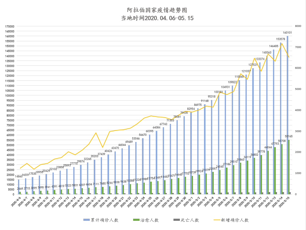 截至当地时间5月16日0点,阿拉伯国家累计确诊160101例,死亡2335例,治愈55165例,其中18个国家出现新增确诊病例共计6523例,小幅下降。沙特单日新增再创新高。伊拉克疫情持续反弹,多座城市被封。约旦、巴勒斯坦疫情稳定;突尼斯、黎巴嫩在诊人数稳步下降。多个海合会成员国启用新冠病毒检测移动巴士,关注劳工聚集区卫生防疫,对违反防疫规定人员予以重罚;根据英国智库报告,阿联酋、科威特疫情防控效率分别居阿拉伯国家第一、二位。北非国家各项保障计划稳定经济可持续发展。吉布提、利比亚疫情稳定,正加紧提升收治能力,逐步放宽禁令;也门累计确诊已破百例。开斋节将至,多国限制庆祝活动,防止人员聚集导致疫情扩散。我驻埃及商务公参在埃媒体发表署名文章;中国向突尼斯提供新一批物资援助。