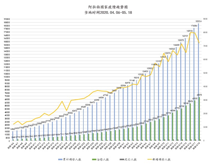 截至当地时间5月19日0点,阿拉伯国家累计确诊183314例,死亡2516例,治愈68575例,其中18个国家出现新增确诊病例共计7228例,降幅明显。阿联酋、沙特、摩洛哥在诊人数出现下降趋势。约旦、突尼斯疫情稳定;巴勒斯坦、黎巴嫩今日新增出现小幅上涨,各国继续扩大行业保障范围,减轻疫情对弱势群体收入冲击。海合会成员国继续谨慎开放部分商业和公共场所,强调佩戴口罩的重要性,近期多国民众遵守防疫规定情况良好,已有国家着手制定复工阶段的常态化防疫举措。北非国家或延长国家紧急状态,或制定下一阶段详细的防疫规定,严防开斋节期间疫情恶化。伊拉克、吉布提今日新增涨幅较大,伊拉克已有多座城市重启全面出行禁令;苏丹、索马里、毛塔、也门疫情持续扩散,苏丹已延长全面出行禁令,索马里获世界银行资金支持。第73届世界卫生大会召开之际,多国政要、社会活动家呼吁世界各国团结一致,共同抗击新冠疫情。多国宗教事务负责人呼吁民众开斋节期间居家礼拜,减少外出和聚会,自觉承担社会责任。我驻阿联酋、科威特、埃及大使在当地主流媒体发文;我驻伊拉克、索马里大使、驻巴勒斯坦办事处主任与当地官员会面或通电话。