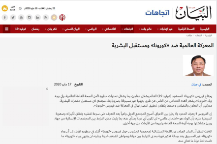 中国驻科威特大使馆: 5月18日,在第73届世界卫生大会召开之际,科最大阿文报纸《消息报》和英文报纸《科威特时报》发表我驻科大使李名刚的署名文章《坚持团结合作,同心共战疫情》。文章回顾了中国自疫情爆发以来在国际上所付出的努力及提供的援助,对中科两国间互帮互助的国际大爱表示赞赏。李名刚呼吁所有国家坚定信心、齐心协力,相信各国终将彻底战胜疫情。