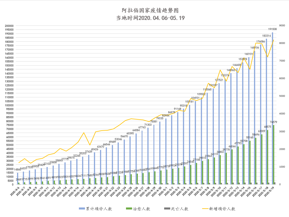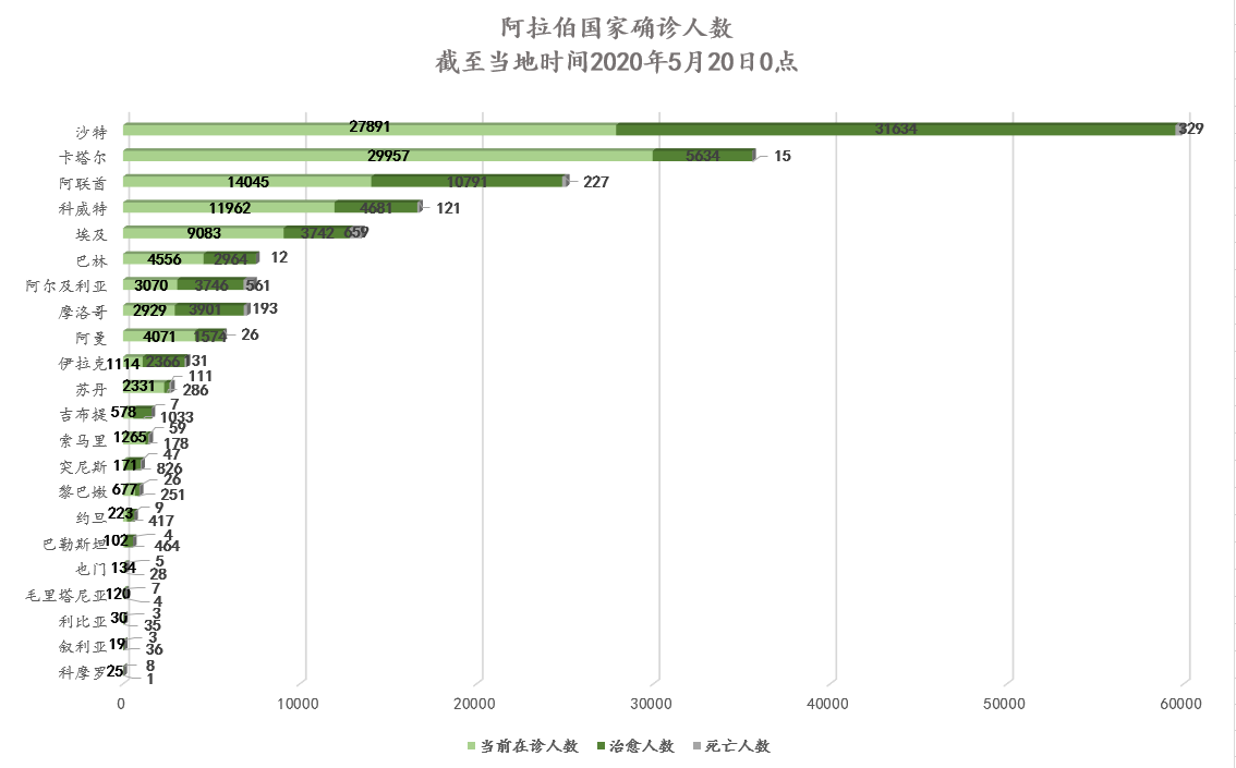 截至当地时间5月20日0点,阿拉伯国家累计确诊191508例,死亡2576例,治愈74579例,其中21个国家出现新增确诊病例共计8194例,再创单日最大增幅。科威特单日新增创新高。沙特、摩洛哥在诊人数下降。约旦、黎巴嫩、突尼斯、巴勒斯坦疫情稳定,阿克萨清真寺将在开斋节后重新开放。海合会国家斋月期间确诊病例涨幅较大,仍存在大量民众违禁现象,各国继续分阶段恢复商业活动,其中阿联酋将自6月起允许外国人入境。北非国家中,摩洛哥疫情首先出现向好趋势,每日新增确诊数已显著下降,且治愈率不断提高;埃及将收到世界银行抗疫援助资金。伊拉克多省成为疫情重灾区,或面临第二次疫情潮;吉布提、苏丹今日新增涨幅较大;索马里、科摩罗、毛塔、也门疫情持续扩散,多国面临医疗物资短缺困境;战火加剧利比亚人道主义危机,让疫情防控局势更加艰难。开斋节将至,多国已出台或正着手制定节日疫情防控方案,谨防疫情恶化。我驻伊拉克大使、驻巴勒斯坦办事处主任会见当地官员;中国援突尼斯、阿尔及利亚医疗队全力保障当地人民健康;埃及外交部亚洲事务部长高度评价中国抗疫成果。