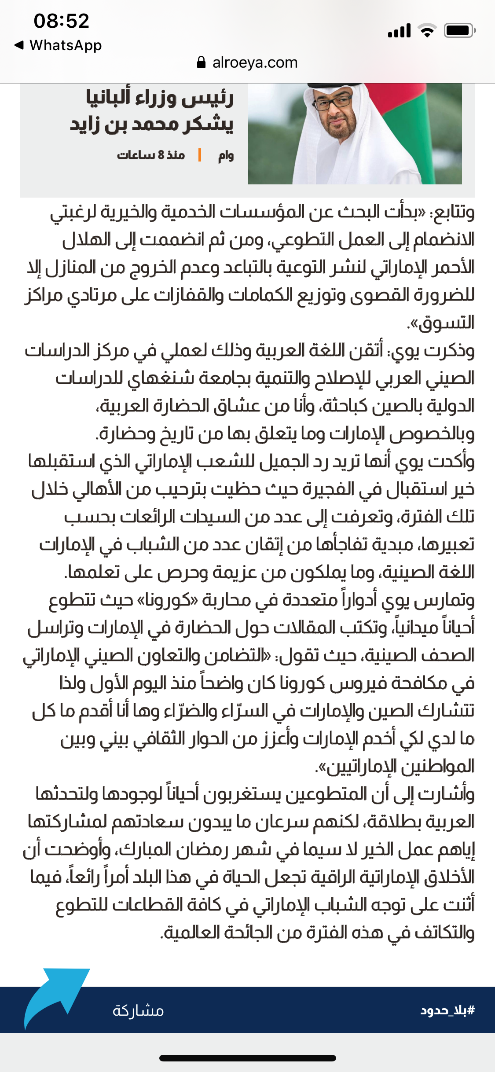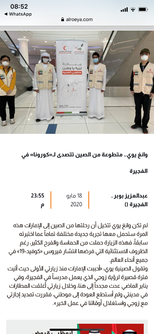近日,上海外国语大学|中阿改革发展研究中心实习研究员王煜在阿联酋富查伊拉参加志愿活动,助力阿联酋抗击新冠疫情。本次志愿活动在阿联酋主流媒体《观点报》(Alroeya)进行了报道,主要内容如下: