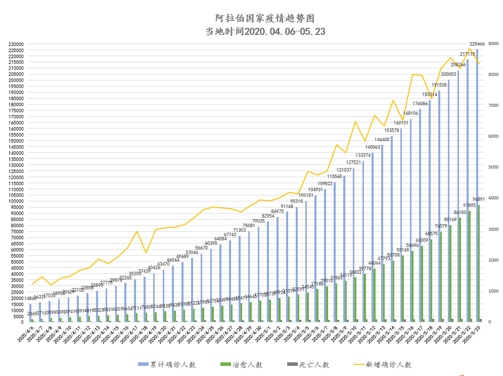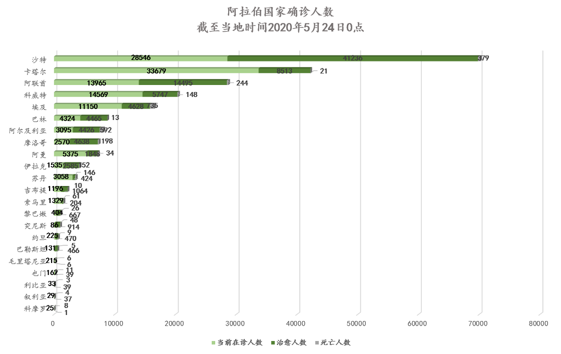 截至当地时间5月24日0点,阿拉伯国家累计确诊225466例,死亡2874例,治愈96891例,其中17个国家出现新增确诊病例共计8351例,小幅下降。沙特累计确诊数破7万例;科威特累计确诊数破2万例。约旦、突尼斯、巴勒斯坦、黎巴嫩疫情稳定,其中突尼斯收到世界银行抗疫贷款援助。多个海合会成员国抗疫期间表现受到国际组织赞赏,继续加强开斋节疫情防控,保障受疫情影响人民正常生活;北非国家中摩洛哥在诊人数持续下降,将对各行各业实施逐步解封。苏丹、伊拉克今日新增涨幅较大,继续加强封闭和消毒措施,保障医护人员安全,伊拉克考虑在做好常态化防疫措施的前提下重开校园及行政部门。开斋节之际,多国取消开斋节聚礼或关闭清真寺,减少人员聚集。吉布提驻华大使接受人民网采访;我驻黎巴嫩大使接受当地媒体采访;阿语版《携手并肩》歌颂中埃友谊。