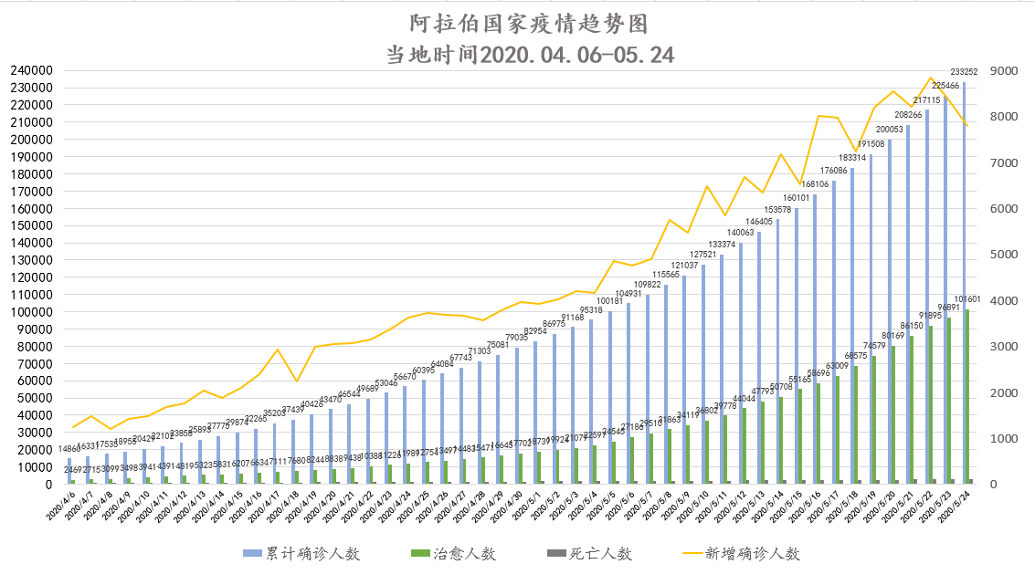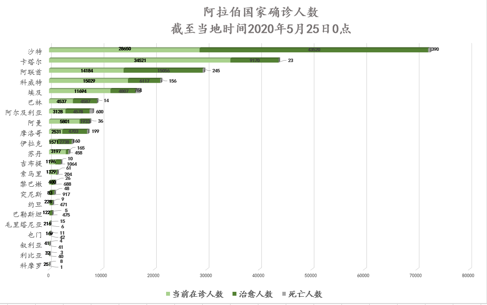 截至当地时间5月25日0点,阿拉伯国家累计确诊233252例,死亡2967例,治愈101601例,其中19个国家出现新增确诊病例共计7786例,降幅明显。开斋节之际,疫情已经得到初步控制的国家,已小范围开放清真寺,民众可在做好防疫措施的前提下进行礼拜,疫情形势依旧严峻的国家则继续关闭清真寺等公共场所,呼吁民众居家礼拜。约旦、突尼斯、巴勒斯坦、黎巴嫩疫情稳定,多国经济受到疫情严重冲击。多个海合会成员国公布疫情报告显示,确诊患者大多为患有慢性疾病的老年人,且多为轻症和中症患者,将继续加强巡逻检查,严打违规行为,其中科威特正对全面出行禁令的实施效果进行评估,为制定后续防疫措施做准备;北非国家中摩洛哥在诊人数持续下降,鼓励中小企业加入医疗物资生产队伍。伊拉克、苏丹今日新增涨幅明显,多省开斋节期间实施全面出行禁令,新设检测实验室。我驻伊拉克大使拜会伊新任总理;援阿尔及利亚抗疫医疗专家组同中资企业、侨民、留学生代表视频连线会议。