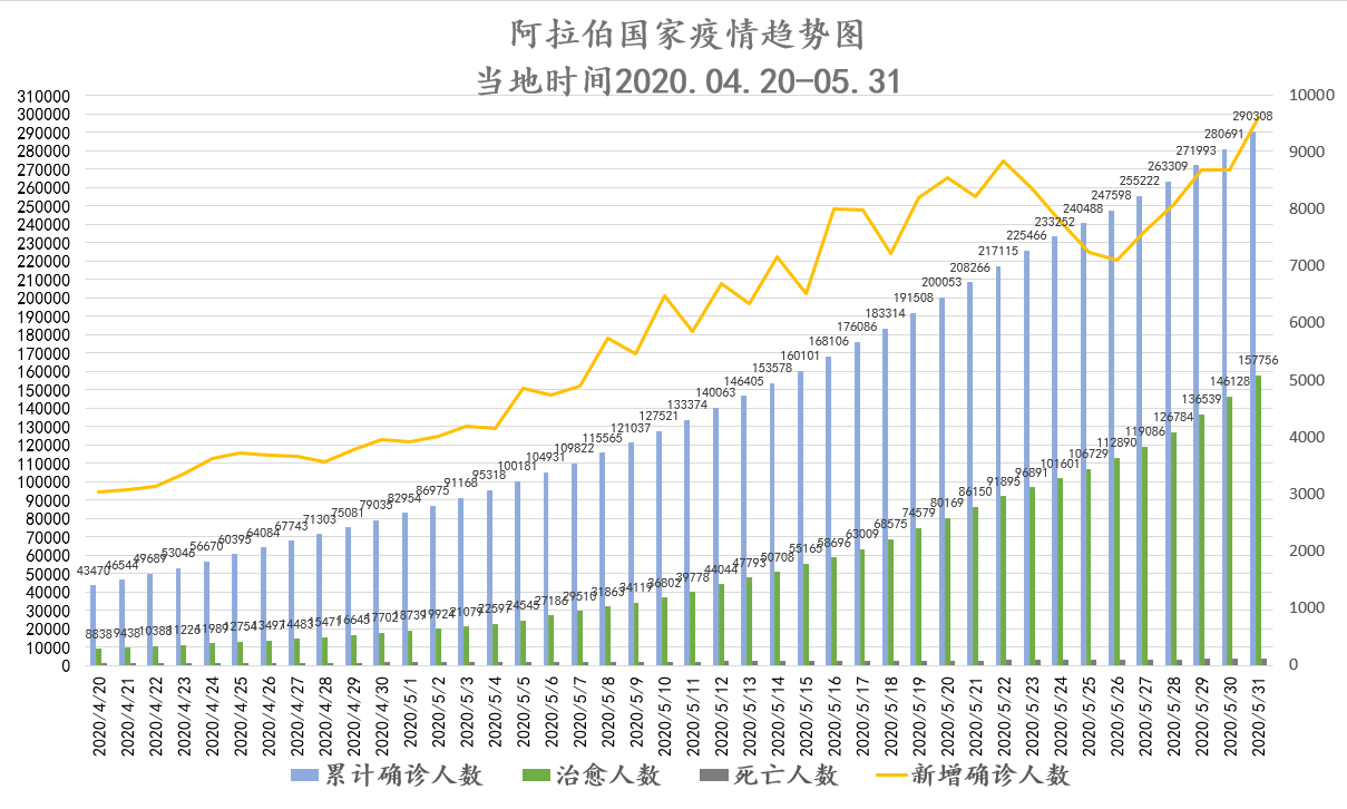 截至当地时间6月1日0点,阿拉伯国家累计确诊290308例,死亡3697例,治愈157756例,其中20个国家出现新增确诊病例共计9617例,再创单日最大增幅。埃及单日新增确诊及死亡人数均创下历史新高,死亡人数位居阿拉伯国家首位;阿曼单日新增确诊创新高,累计确诊人数破万。约旦、突尼斯、巴勒斯坦、黎巴嫩目前疫情稳定,突尼斯省高校师生接受免费新冠病毒检测。多个国家疫情形势持续向好,沙特累计治愈人数超6万人,在诊人数已连续6日呈下降趋势;卡塔尔连续4日在诊人数下降,治愈率创历史新高达53.22%;科威特、巴林在诊人数下降,新增治愈数创最高记录;阿尔及利亚已连续7日单日新增确诊数呈下降趋势,治愈率升至历史最高水平;摩洛哥在诊人数下降,感染率降至历史最低,为27.45%。部分国家疫情形势仍胶着,伊拉克近半个月以来新增确诊涨幅明显,感染率已上升至一个月以来最高水平,已延长出行禁令一周;苏丹感染率和死亡率持续上升,继续强化疫情防范措施,保障医务人员生命健康安全;也门死亡率达24.77%,为世界最高,治愈率仅为4.33%,联合国已提供医疗物资援助。疫情好转国家进一步放宽出行限制,开放商业和宗教场所,推出经济刺激计划,改善营商环境,降低投资成本,扩大内需促进经济复苏,其中卡塔尔航空已逐步恢复全球航线网络。我驻毛塔大使、巴勒斯坦办事处主任会见当地官员;中国将为约旦提供总价值约5280万元的医疗物资援助。