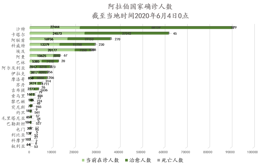 截至当地时间6月4日0点,阿拉伯国家累计确诊316789例,死亡4085例,治愈182124例,其中20个国家出现新增确诊病例共计9154例,小幅上升。约旦、突尼斯、巴勒斯坦、黎巴嫩、摩洛哥疫情稳定。沙特、阿尔及利亚、科威特在诊人数下降,治愈率升至历史最高;卡塔尔、阿联酋累计治愈人数已大幅超过在诊人数,治愈率稳步提升; 埃及单日新增确诊数出现下降趋势,新增治愈创历史最高记录。伊拉克、阿曼、毛塔疫情仍不乐观,近日确诊病例数持续大幅攀升;索马里治愈人数有所上升,但自然灾害和新冠疫情给抗疫工作带来巨大挑战。目前各国正处于恢复正常生活的不同阶段,疫情较稳定国家除逐步全面恢复经济活动外,即将开放边境允许游客入境旅游,另一些疫情形势初见好转的国家,正分批次开放公共场所和恢复经济活动,谨慎乐观地接受防疫常态化的现实。此外,叙利亚、索马里、也门等国面临多重挑战,急需国际社会伸出援手。我驻科威特大使接受当地主流媒体专访,援苏丹医疗专家组与苏医疗专家交流。
