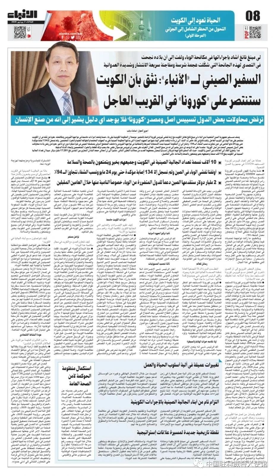 中国驻科威特大使馆:日前,科最大阿文报纸《消息报》刊发对我驻科大使李名刚的专访,李名刚重点介绍了习近平主席在第73届世界卫生大会视频会议开幕式上的讲话精神、中国抗击新冠疫情经验及开展抗疫国际合作等情况,并就病毒溯源等问题阐明立场。