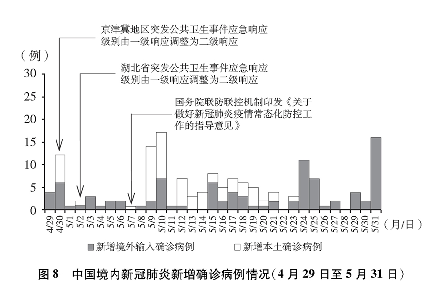境内疫情总体呈零星散发状态,局部地区出现散发病例引起的聚集性疫情,境外输入病例基本得到控制,疫情积极向好态势持续巩固,全国疫情防控进入常态化。加大力度推进复工复产复学,常态化防控措施经受“五一”假期考验。经中共中央批准,国务院联防联控机制派出联络组,继续加强湖北省疫情防控。(图8