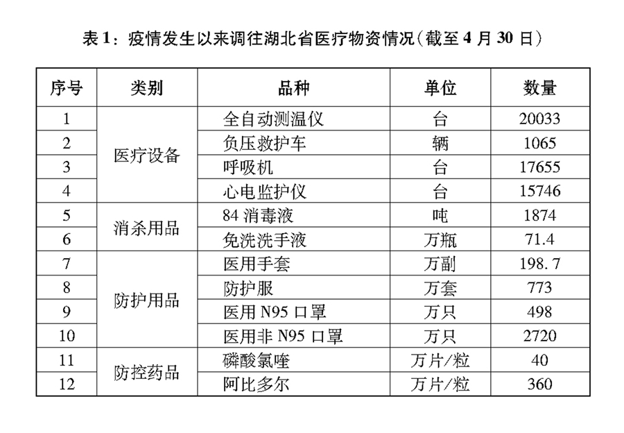 开展新中国成立以来规模最大的医疗支援行动。调动全国医疗资源和力量,全力支持湖北省和武汉市医疗救治。自124日除夕至38日,全国共调集346支国家医疗队、4.26万名医务人员、900多名公共卫生人员驰援湖北。19个省份以对口支援、以省包市的方式支援湖北省除武汉市以外16个地市,各省在发生疫情、防控救治任务十分繁重的情况下,集中优质医疗资源支援湖北省和武汉市。人民解放军派出4000多名医务人员支援湖北,承担火神山医院等3家医疗机构的医疗救治任务,空军出动运输机紧急运送医疗物资。各医疗队从接受指令到组建2小时内完成,24小时内抵达,并自带7天防护物资,抵达后迅速开展救治。在全国紧急调配全自动测温仪、负压救护车、呼吸机、心电监护仪等重点医疗物资支援湖北省和武汉市(表1)。从全国调集4万名建设者和几千台机械设备,仅用10天建成有1000张病床的火神山医院,仅用12天建成有1600张病床的雷神山医院。短短10多天建成16座方舱医院,共有1.4万余张床位。加强临床血液供应,10个省份无偿支援湖北省红细胞4.5万单位,血小板1762个治疗量,新鲜冰冻血浆137万毫升(不含恢复期血浆)。大规模、强有力的医疗支援行动,有力保障了湖北省和武汉市救治,极大缓解了重灾区医疗资源严重不足的压力。