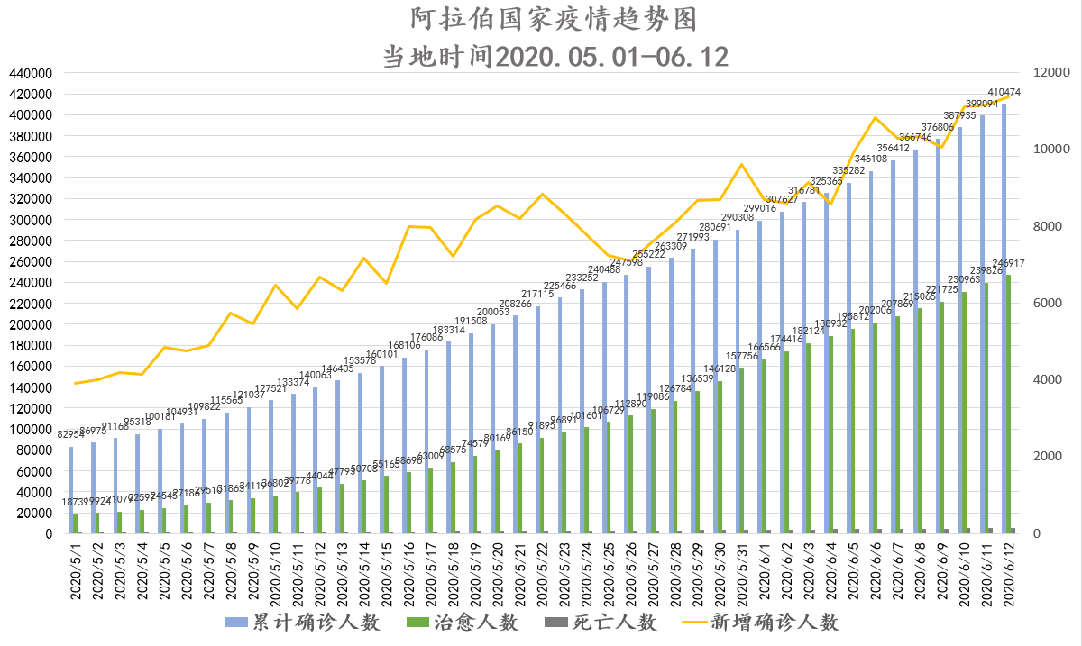 截至当地时间6月13日0点,阿拉伯国家累计确诊410474例,死亡5432例,治愈246917例,其中20个国家出现新增确诊病例共计11380例,再创单日最大增幅。约旦、突尼斯、巴勒斯坦、黎巴嫩、摩洛哥、阿尔及利亚、科摩罗疫情稳定。阿联酋、吉布提、卡塔尔、科威特在诊人数下降,巴林今日在诊人数小幅上升,但各国治愈人数均不断增加; 阿曼累计确诊破2万,近期治愈率明显提高。沙特单日新增再创新高,在诊人数近4万人;埃及、伊拉克、毛塔、也门确诊人数持续攀升,伊拉克在诊人数已超万人。疫情较稳定的国家,已着手开放影院、剧场、清真寺等人群密集型场所;疫情发展形势不明朗的国家,封锁高风险地区,严格管控人员流动,同时抓紧制定下一阶防疫措施,帮助民众尽快适应新常态。我驻苏丹大使接受CGTN采访;援巴勒斯坦医疗专家组拜会巴总理,并为华人华侨举办新冠疫情防控视频交流会;广交会云推介黎巴嫩专场活动成功举办。