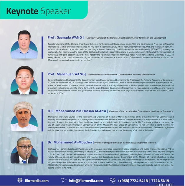 本次会议聚焦于阿曼“2040愿景”下的开创性国家规划及其已取得的成就,旨在探讨应对本国及全球变化的前瞻性战略,推动经济与社会的持续增长。会议为政府机构、私营部门及学术机构提供宝贵平台,促进经验交流与创意分享,共同助力实现国家发展目标,巩固阿曼作为区域创新与可持续发展枢纽的地位。会议设有六大主题,与会专家学者围绕国家愿景与战略规划、国家规划与成就、创新与数字化转型、可持续发展与国际伙伴关系、最佳领导和管理实践、预见未来议题展开深入交流与讨论。国家行政学院教授王满传、阿曼工商会劳动力市场委员会主席穆罕默德·本·哈桑·阿兰西(H.E. Mohammed bin Hassan Al-Ansi)、摩洛哥公法高等教育教授穆罕默德·阿尔穆丹(Mohammed Al-Mouden)、阿曼电信公司“Ooredoo”董事会副主席易卜拉欣·本·赛义德·里亚米(Ibrahim bin Said Al-Riyami)与阿曼交通、电信与信息技术部技术项目办公室主任纳赛尔·本·穆罕默德·法纳赫(Nasser bin Mohammed Al-Fannah)等多位嘉宾发表主旨演讲。