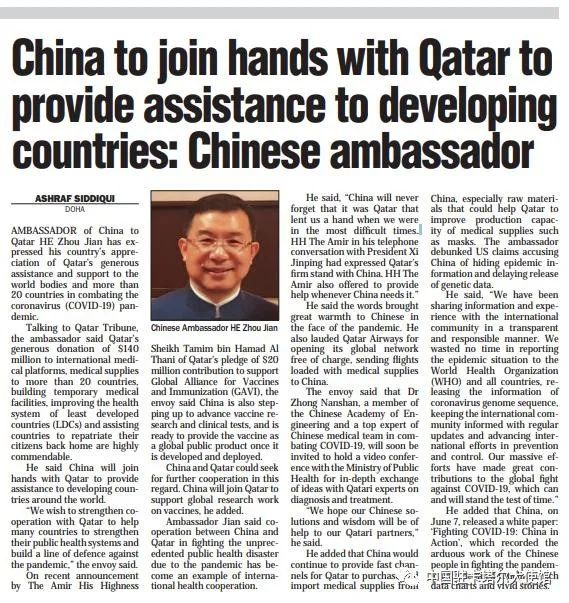 中国驻卡塔尔大使馆:6月15日,周剑大使接受《卡塔尔论坛报》采访,积极宣介中国政府发布的《抗击新冠肺炎疫情的中国行动》白皮书,深入解读中国抗疫成就与经验,详细介绍中卡抗疫合作成果及下阶段合作方向。