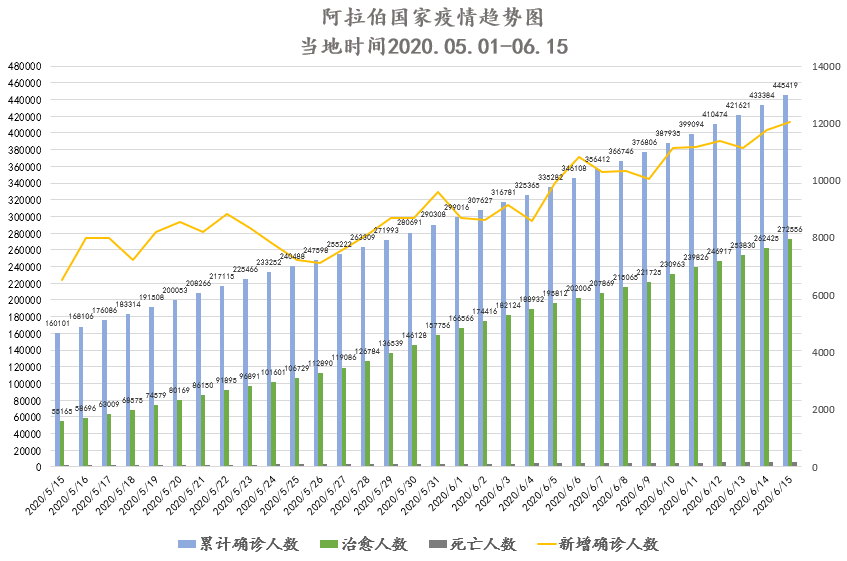 截至当地时间6月16日0点,阿拉伯国家累计确诊445419例,死亡6154例,治愈272556例,其中20个国家出现新增确诊病例共计12035例,再创单日最大增幅。约旦、突尼斯、巴勒斯坦、黎巴嫩、摩洛哥、阿尔及利亚、科摩罗、吉布提和阿联酋疫情稳定。卡塔尔、科威特在诊人数下降,卡塔尔累计确诊破8万;阿曼、苏丹近期治愈率稳步提升;伊拉克今日新增治愈人数创历史最高记录,累计治愈人数正逐渐追平在诊人数。巴林今日新增病例涨幅较大,但暂未见明显反弹迹象;沙特、埃及、也门、毛塔今日新增病例数再创新高,沙特累计确诊破13万,3天内已新增1万多例。为应对后疫情时期的各类挑战,多国成立专项委员会或多次召开专题会议,为疫情防控常态化形势下的经济发展、旅游业复苏、能源合作及教育问题提出对策。我驻巴林大使、驻卡塔尔大使、驻巴勒斯坦办事处主任接受当地主流媒体采访;中国援巴勒斯坦医疗专家组赴多地考察交流并接受采访;援毛塔首批医疗物资运抵。