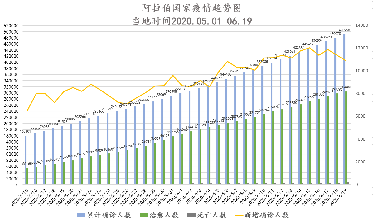 截至当地时间6月20日0点,阿拉伯国家累计确诊490958例,死亡7171例,治愈304462例,其中19个国家出现新增确诊病例共计10880例,继续小幅下降。约旦、突尼斯、黎巴嫩、阿尔及利亚、科摩罗、吉布提、阿联酋疫情稳定。巴林、卡塔尔、科威特在诊人数下降;阿曼累计治愈人数已超过在诊人数,且每日新增病例数呈下降趋势。伊拉克、苏丹、毛塔、也门近期治愈人数显著增加,但每日新增确诊数依旧维持高位;巴勒斯坦、摩洛哥疫情反弹明显,摩洛哥今日新增确诊人数激增,创疫情暴发以来最高记录;沙特、埃及每日新增病例居高不下,沙特累计确诊已破15万。疫情形势仍胶着的国家不断更新治疗方案,借鉴外国先进疗法,部分国家治疗方案已有26种。疫情出现反弹的国家再次面对疫情,相关应对措施更显从容,已再次开放新冠收治中心,加强高风险区域检测和消毒工作。中国政府援苏丹医疗物资运抵,驻苏丹大使会见苏过渡政府官员,驻埃及大使在当地主流媒体发文。
