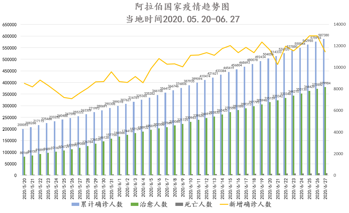 截至当地时间6月28日0点,阿拉伯国家累计确诊587380例,死亡9257例,治愈379984例,其中18个国家出现新增确诊病例共计11464例,大幅下降。约旦、突尼斯、黎巴嫩、科摩罗、吉布提、卡塔尔、阿联酋疫情稳定,也门治愈率缓步提升。沙特、科威特、巴林近期新增病例涨幅波动较大,整体呈上升趋势,但治愈率较稳定,疫情仍然可控。伊拉克、阿曼、埃及单日新增确诊继续保持高位;阿尔及利亚新增病例持续上涨,反弹趋势明显,今日新增病例创历史最高记录;巴勒斯坦、摩洛哥疫情持续反弹,巴勒斯坦再创单日最大增幅;毛塔、利比亚、叙利亚疫情持续蔓延。疫情反弹较严重的国家,部分省份已重启全面出行禁令,加大对举办和参加聚集性活动者的惩罚力度。临近7月,多国开放边境、国际航班复飞计划提上日程,大部分国家均要求入境人员提供新冠病毒检测呈阴性报告或进行医学隔离。《张文宏教授支招防控新型冠状病毒》手册阿文版在埃及正式发布,助力埃及民众适应疫情防控常态化。