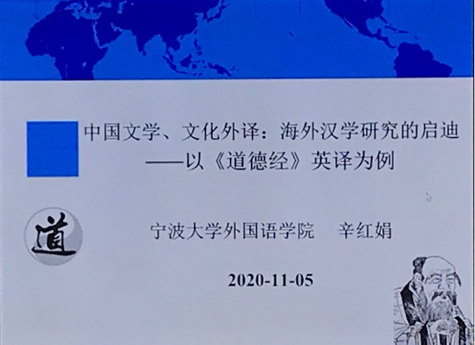 2020年11月5日下午,应上海外国语大学语料库研究院邀请,宁波大学外国语学院副院长辛红娟教授做了题为“中国文学、文化外译:海外汉学研究的启迪——以《道德经》为例”的精彩讲座,讲座由上外语料库研究院院长胡开宝教授主持。