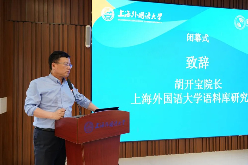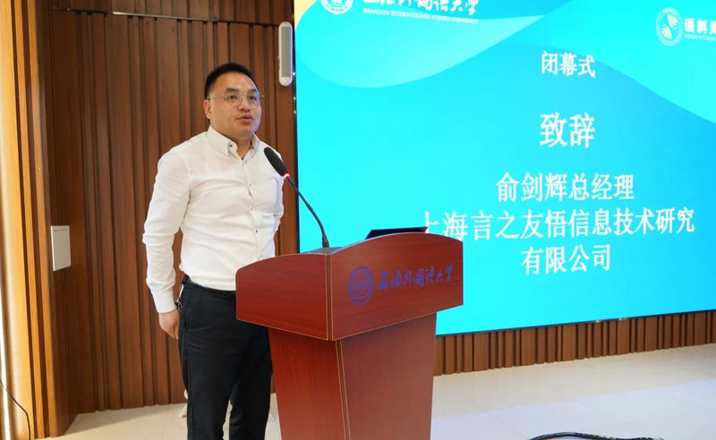 论坛闭幕式由上海外国语大学耿强副教授主持,上海言之友悟信息技术研究有限公司俞剑辉总经理、上海外国语大学语料库研究院院长胡开宝教授致闭幕辞。俞剑辉总经理从企业代表视角发表了对于新文科建设的认同与希望,期待新文科为企业带来高质量生源,提供更多校企合作机会。胡开宝教授向出席会议的专家学者表示了衷心感谢,并指出本次会议主题鲜明、层次多元,既有宏观理论构建,探讨新文科的理据、特征、专业建设、人才培养,又有具体实践经验,将新文科的理念贯彻落地,为新文科背景下外语学科的建设与发展这一命题提供了有益的破题和解题思路。