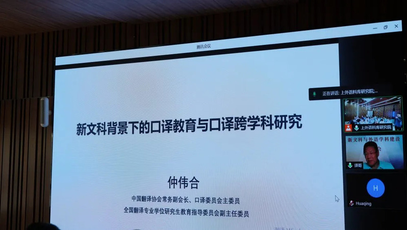 中国翻译协会常务副会长兼口译委员会主任仲伟合教授从外语学科发展面临的国内国际背景谈起,详细分析了口译教育与口译研究的现状与问题,并阐释了在新文科建设、口译实践、口译学科、新技术推动四大要求下口译跨学科发展的方法与框架,为未来口译教育与口译研究指明了方向。