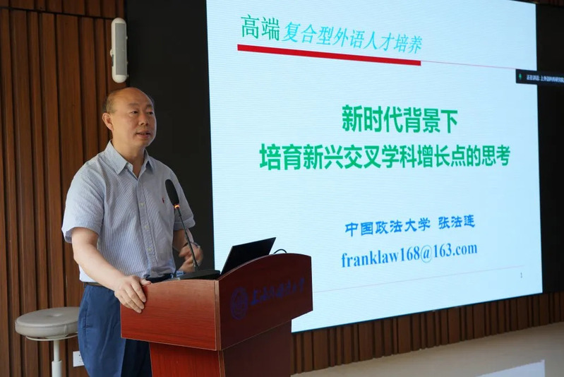 中国政法大学张法连教授结合新时代国家对外开放背景与高校外语教育现状,从外语和法律交叉融合角度,介绍了法律外语学科的内涵、用途与战略意义,指出了培养涉外法律人才的现实性与迫切性。