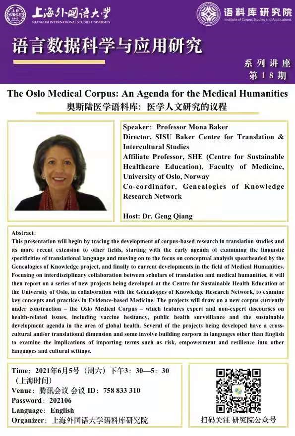 2021年6月5日下午三点半,贝克翻译与跨文化研究中心主任Mona Baker教授做了题为《奥斯陆医学语料库:医学人文研究的议程》的讲座。讲座在腾讯会议上进行,由上海外国语大学语料库研究院耿强副教授主持。