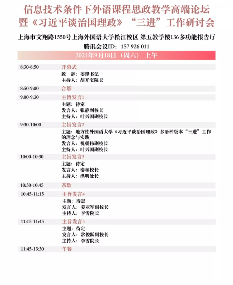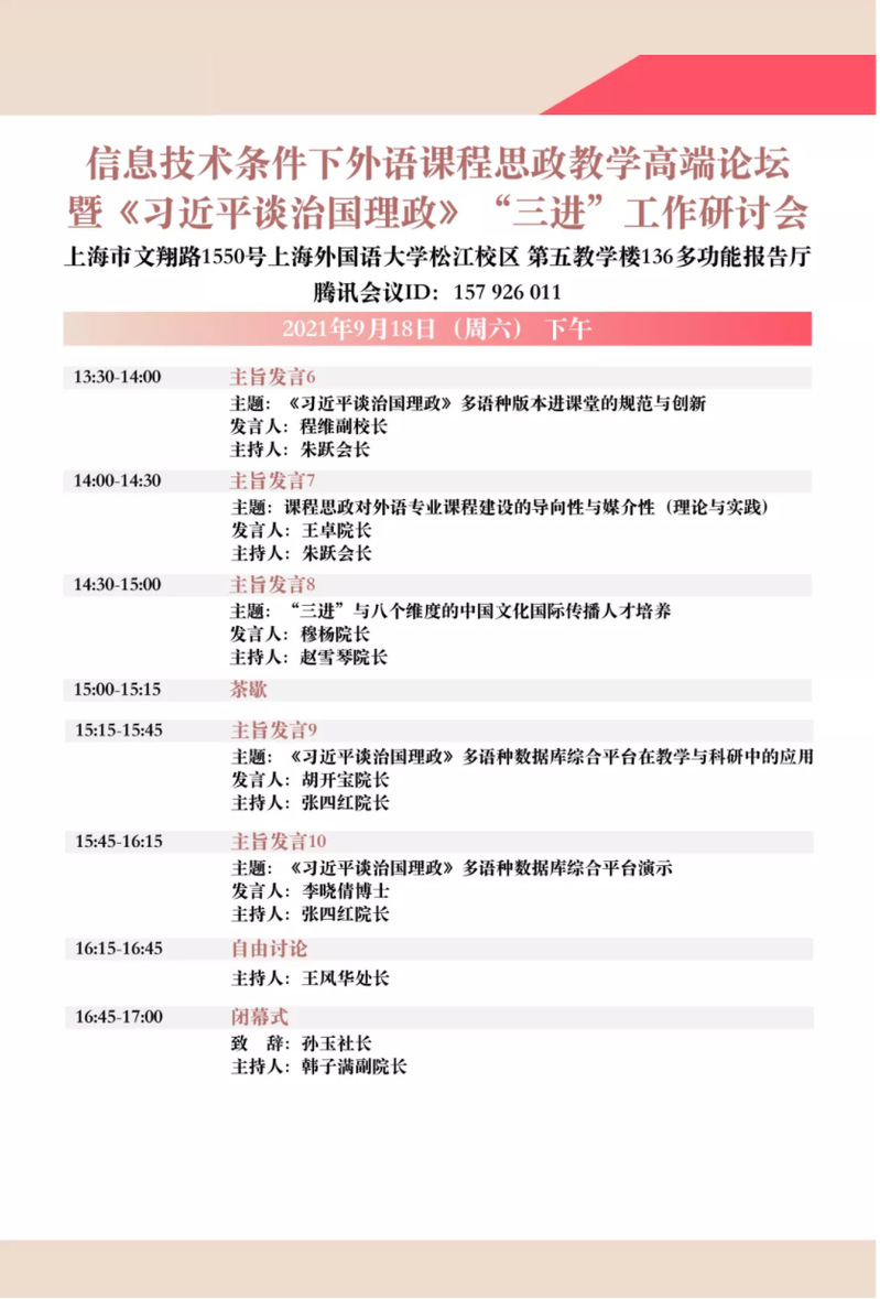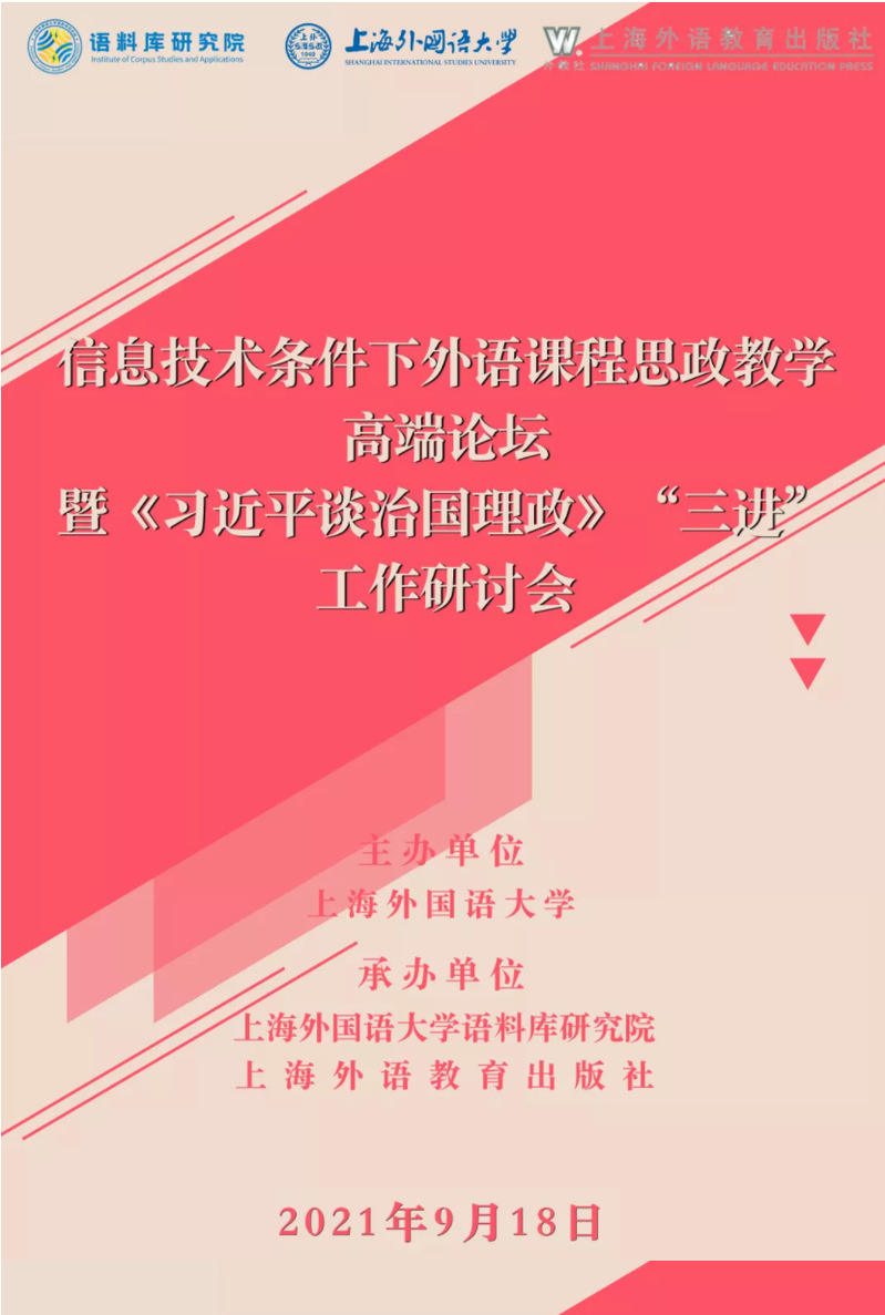 二十一世纪以来,信息技术发展迅猛,愈来愈广泛地应用于外语教学之中,促使外语教学在教学理念、方法和手段等层面发生了重大变化。近年来,国内高校开始全面推进课程思政教学。在这一历史语境之中,如何推进信息技术在外语课程思政教学中的应用,提高外语课程思政教学的成效,需要我们认真思考并做出回答。为推动信息技术条件下外语课程思政教学,同时为了推进中宣部2019年启动的《习近平谈治国理政》多语种版本进高校、进教材、进课堂(以下简称为“三进”)试点工作,上海外国语大学语料库研究院和上海外语教育出版社决定于2021年9月18日联合召开信息技术条件下外语课程思政教学高端论坛暨《习近平谈治国理政》“三进”工作研讨会。欢迎各位专家学者拨冗参会。