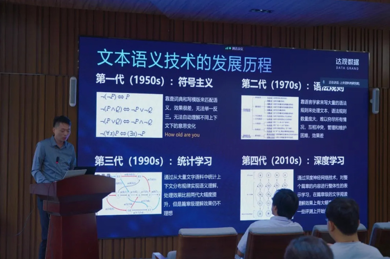 达观数据CEO陈运文博士从人类文字处理技术的发展史讲起,指出智能来源于大规模文字数据挖掘,并展示了达观数据自然语言处理Demo在词性标注、语义分析、信息抽取等方面的智慧功能,展现了人工智能在文本处理中的具体应用场景。