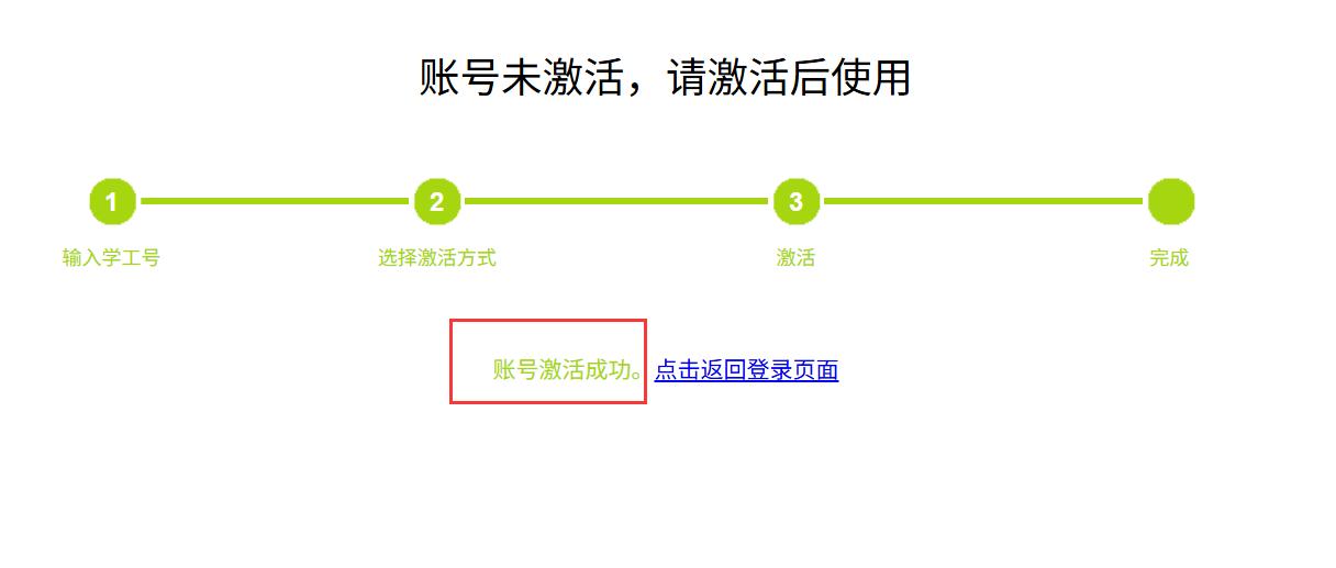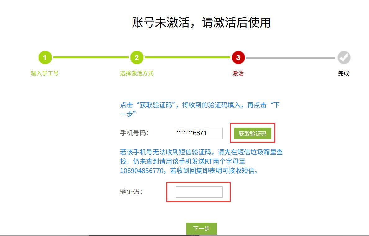Step 5: 填入收到的短信验证码或Email内的验证码之后,点击“下一步”,页面中显示“账号激活成功”: