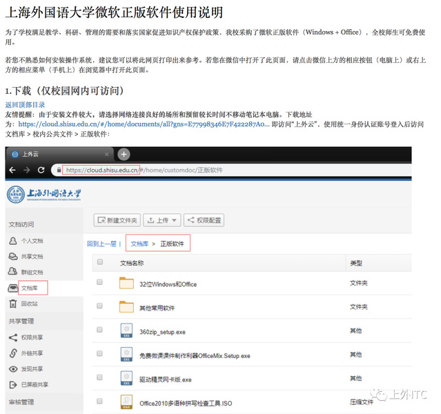 通过“正版上外”网站可以轻松找到Office正版软件的下载地址,但是有些软件涉及到不同系统的激活问题,为了方便老师同学们下载,ITC为大家提供了正版Windows操作系统和Office办公软件的详细安装激活步骤。点击链接即可查看详细步骤~