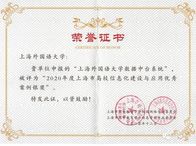 经专家评审,“上海外国语大学数据中台系统”案例荣获优秀案例银奖。上海外国语大学在信息化建设过程中,立足本校实际情况,充分考虑软硬件系统的实用性和先进性,在全国高校中较早地建设了“大数据分析与决策平台”和“数据中台”。这些系统在“新冠”疫情期间有效支持了学校的网上教学、网络办公和校区人员管控等工作的顺利开展。