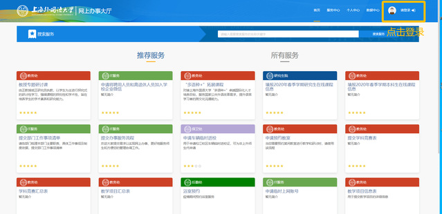 申请信息系统(网站)维护VPN账号,首先进入上海外国语大学网上办事大厅网页(ehall.shisu.edu.cn),点击右上角登录。