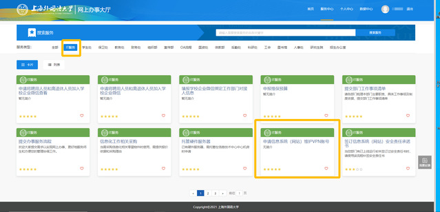 登陆后,点击服务类型中的“IT服务”,即可找到“申请信息系统(网站)维护VPN账号”。